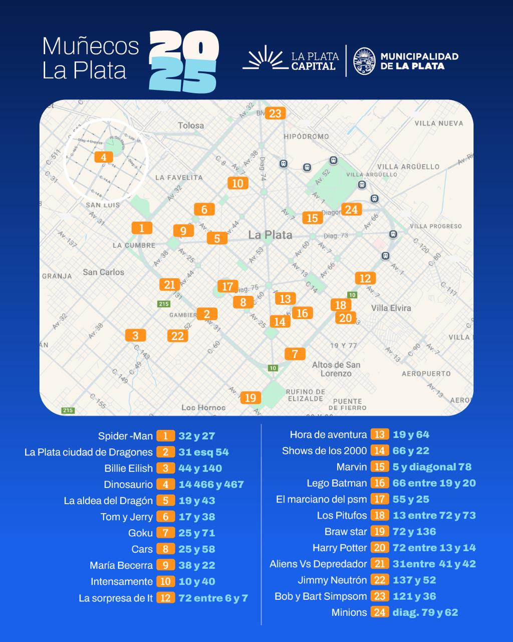 Completan la nómina de momos de la tradicional quema “La Plata ciudad de Dragones”, en 31 y 54; un dinosaurio en 14 entre 466 y 467, “Hora de aventura” en 19 y 64; y el marciano del psm en 55 y 25.