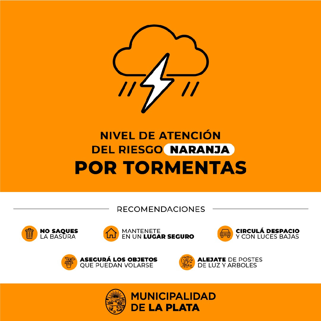 La Municipalidad de La Plata elevó a ‘naranja’ el Nivel de Atención del Riesgo (NAR) debido a las tormentas pronosticadas en el partido de La Plata.