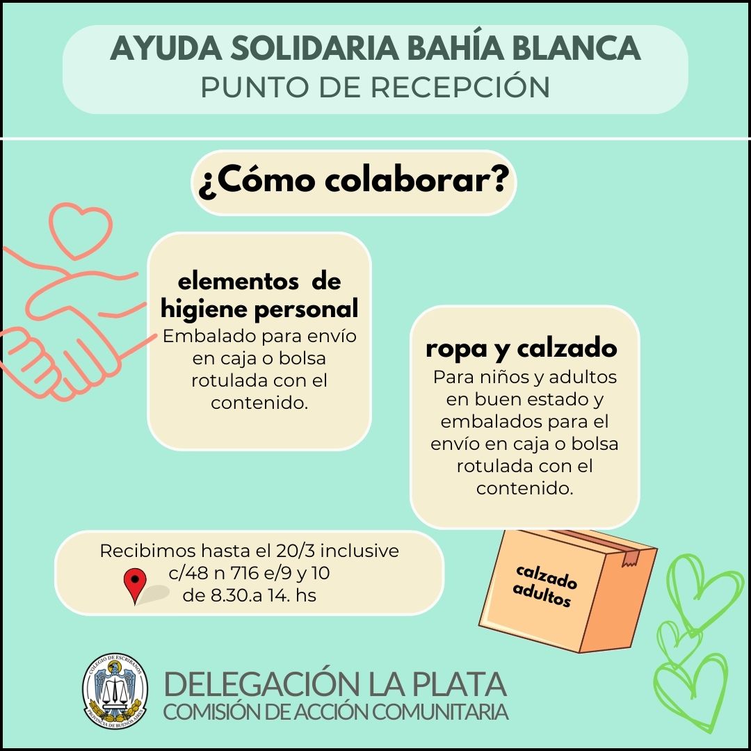 La Delegación La Plata del Colegio de Escribanos de la Provincia, a través de su Comisión de Acción Comunitaria, se encuentra recibiendo hasta el jueves 20 de marzo, elementos de higiene personal, ropa y calzado, para colaborar con la ciudad de Bahía Blanca, en este difícil momento.