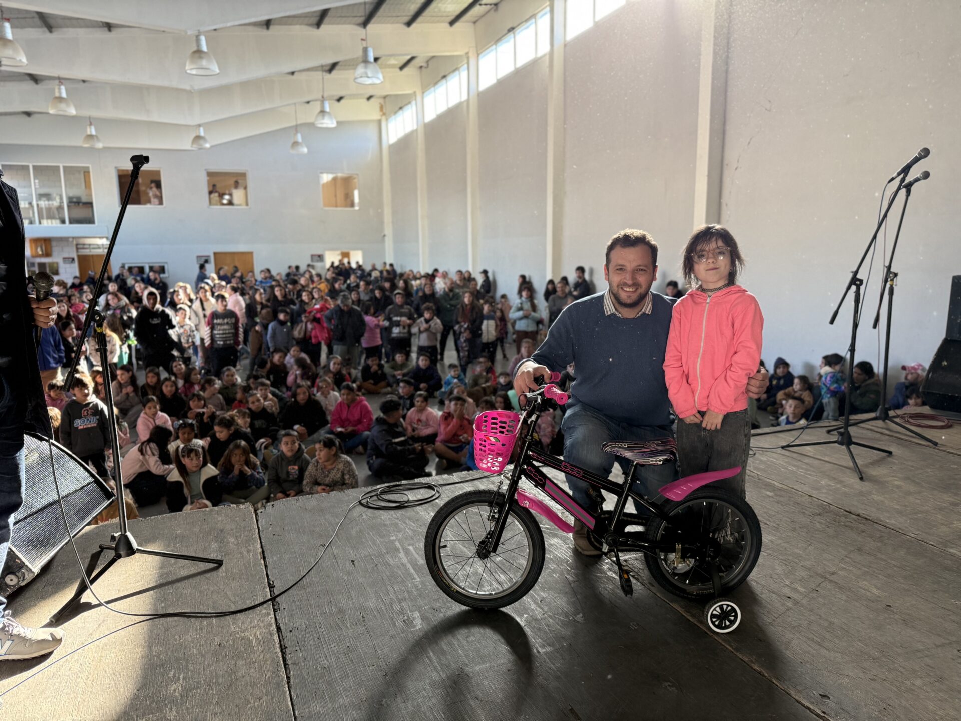 Además, se entregaron bicicletas y juguetes como regalos, y compartimos chocolate y tortas para todos.