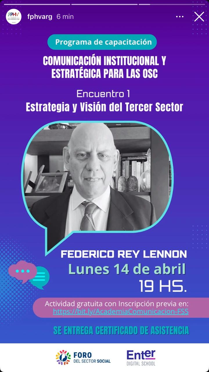 El primer encuentro, titulado “Estrategia y visión del tercer sector”, estará a cargo del especialista Federico Rey Lennon y se realizará el lunes 14 de abril a las 19 hs. La participación es gratuita, con inscripción previa a través del enlace: https://bit.ly/AcademiaComunicacion-FSS