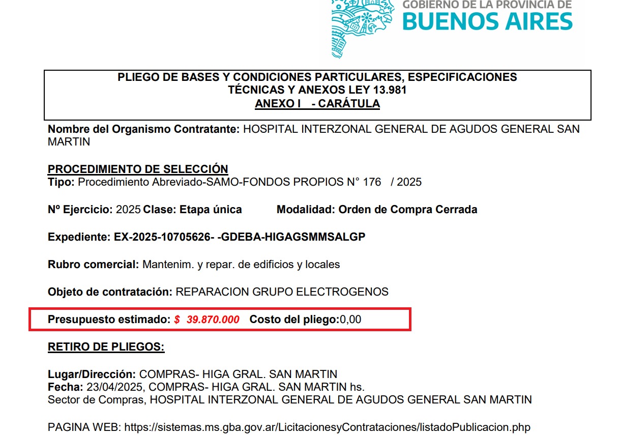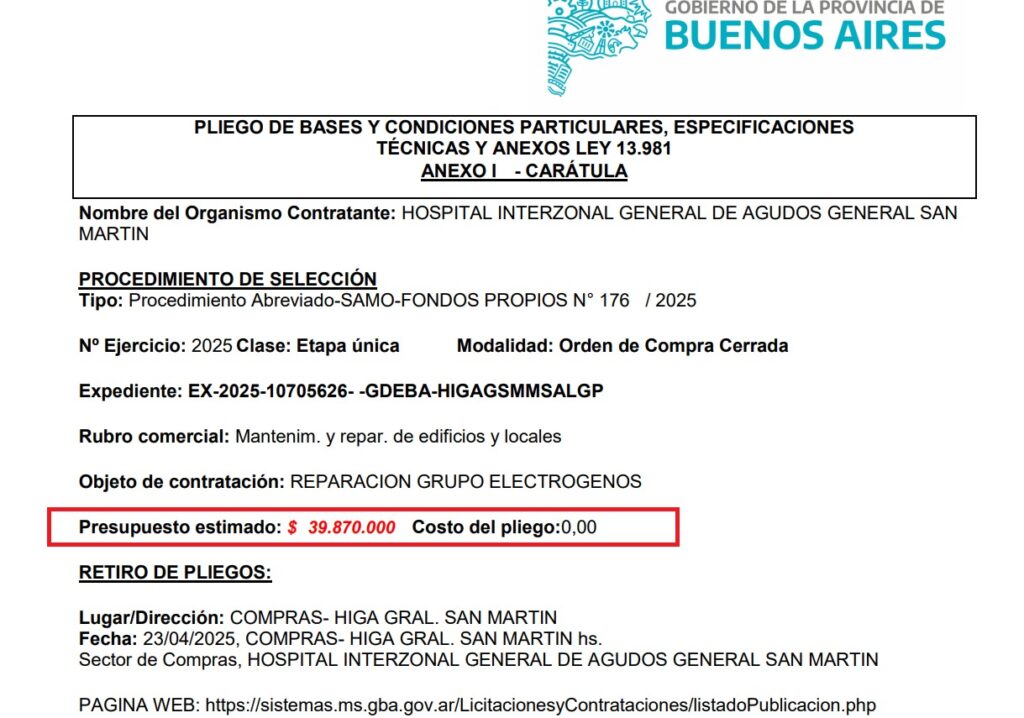 La contratación, por única vez, contempla la reparación de un grupo electrógeno quemado —con la bobina rota— y el mantenimiento de otro en uso. Sin embargo, fuentes internas del hospital señalan que, en una visita reciente, ambos equipos funcionaban correctamente, lo que plantea dudas sobre la veracidad de la urgencia declarada.