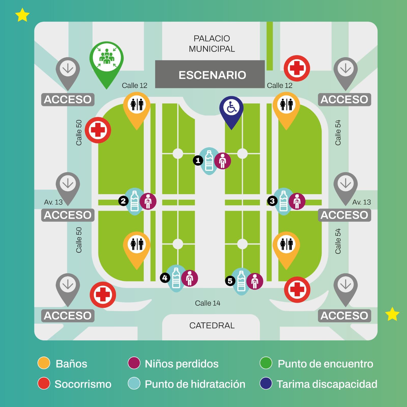 Asimismo, ABSA instalará puntos de hidratación frente al escenario, en 51 y 13, 53 y 13, 51 y 14 y 53 y 14, donde los vecinos podrán recargar sus botellas y mantenerse hidratados durante la jornada. Estos también oficiarán como espacios especiales para niñeces perdidas, facilitando el encuentro de los más pequeños con sus familiares.