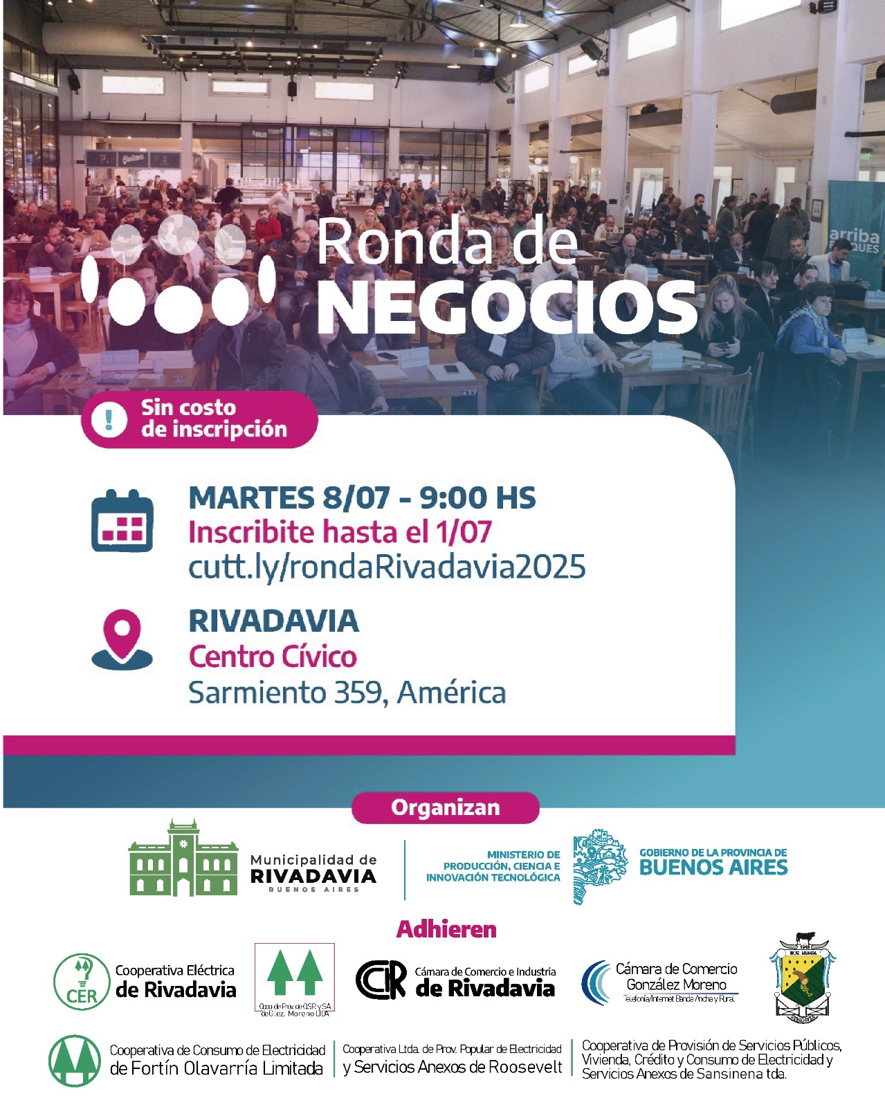 La participación es gratuita y está dirigida a PyMEs industriales, de servicios, comercios y emprendimientos que deseen establecer vínculos estratégicos y ampliar sus redes de contacto. La inscripción estará abierta hasta el 1 de julio a través del siguiente enlace: cutt.ly/rondaRivadavia2025. Una vez finalizado el período de inscripción, se habilitará la selección de empresas para coordinar entrevistas.
