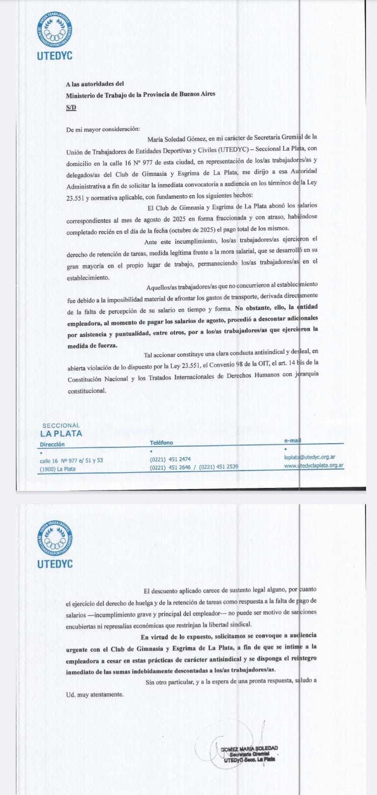 La Unión de Trabajadores de Entidades Deportivas y Civiles (UTEDYC) Seccional La Plata expresa su enérgico rechazo ante los descuentos aplicados por el Club de Gimnasia y Esgrima La Plata a trabajadores y trabajadoras de la institución, en represalia por las medidas de retención de tareas realizadas frente al incumplimiento en el pago de salarios.
